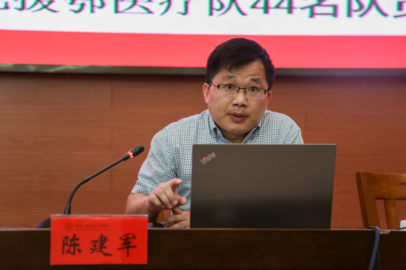 陈建军在报告中分享了他在武汉抗疫期间的工作、生活和抗疫背后的点点滴滴。2月18号,接到组建江苏省第八批援湖北医疗队通知后,陈建军主动报名出征武汉,与队友一道整建制的接管武汉市中心医院后湖院区两个重症病区。在武汉的一个多月,陈建军和他的队友们共收治89名重症新冠肺炎患者,收治患者年龄均偏大,最高年龄89岁。作为重症一区负责人,陈建军与队友每日对重症患者进行查房,并认真学习最新的新冠肺炎诊疗规范,遇到高危操作冲在最前方,为患者量身制定诊疗方案,切实做到重症病人“一人一策,专人负责”,并将重症患者的治疗关口前移,在治疗过程中注重患者基础病的治疗及控制。经过他们的积极努力,无一例患者出现基础病导致的严重并发症,无一例轻型及普通型患者转为危重型患者,无一例患者死亡。在保证患者治疗前提下,他们严格把控,确保病区医护人员的安全与防护,做到了医护人员零感染。陈建军在报告中说“我只是在做医生的分内之事,没有那么伟大,是祖国大后方的支持让我们没有后顾之忧”。他表示“抗疫的胜利不是医护人员的胜利,是整个国家,全国人民的胜利”。因工作突出,陈建军被江苏省人社厅、省卫健委联合表彰为“江苏省卫生健康系统新冠肺炎疫情防控工作先进个人”。