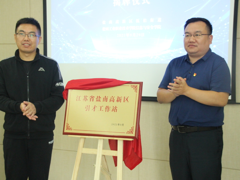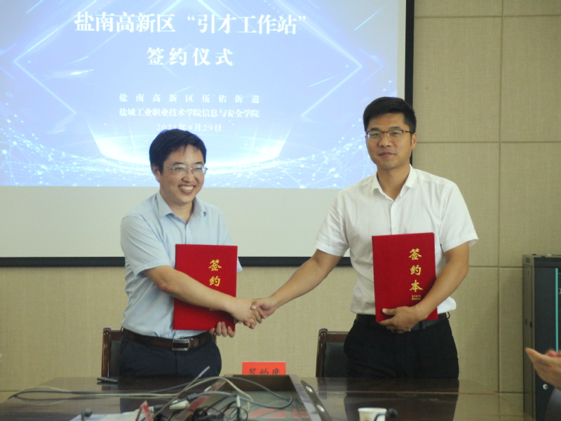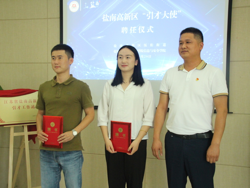 张宜明介绍了盐南高新区产业定位、伍佑街道建设发展以及设立引才工作站的相关内容。在观看了学校的视频介绍后,陈杰介绍了信息与安全学院成立以来的办学情况。赵勇刚和陈杰分别代表双方签订了校地人才战略合作协议。张宜明和王曙东为盐南高新区“引才工作站”揭牌。冯桂冈为盐南高新区“引才大使”乐珮珮和刘凯颁发聘书。