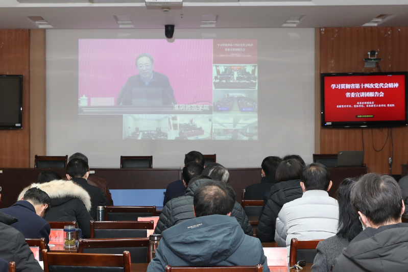与会人员以线上会议的形式聆听了省委宣讲团成员、省委教育工委书记、省教育厅厅长、党组书记葛道凯所作的省第十四次党代会精神宣讲报告。报告中,葛道凯系统回顾了我省过去五年所取得的历史性成就,围绕“争当表率 争做示范 走在前列”三大光荣使命、“六个显著提升”目标任务、“九个方面”重点工作、“五个表率”实践要求等方面,对省第十四次党代会精神作了系统宣讲和深入解读。他指出,省第十四次党代会是一次高举旗帜、民主团结的大会,对于动员全省党员干部不忘初心、牢记使命、万众一心、团结一致,奋力建设好“强富美高”新江苏具有重要的指导意义。