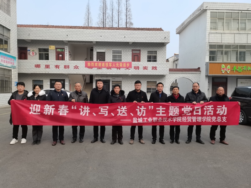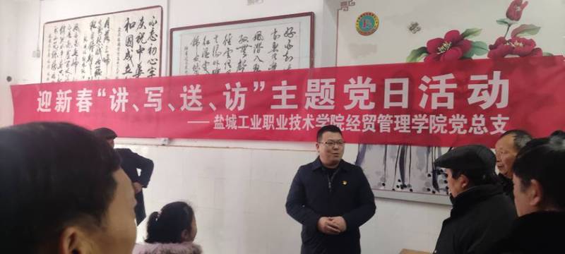 为深化党史学习教育,落实“我为群众办实事”,践行“两在两同”建新功行动,促进校村文化融合发展,助力乡村文化振兴,1月19日,经贸管理学院院长周荣虎,副书记、副院长罗治得、第一党支部书记李萍、第一党支部宣传委员陈传亚、退休教师王宗年等人在盐城市工商联副主席、邵刘村第一书记赵德生的陪同下前往阜宁县罗桥镇邵刘村开展迎新春“讲、写、送、访”主题党日活动。