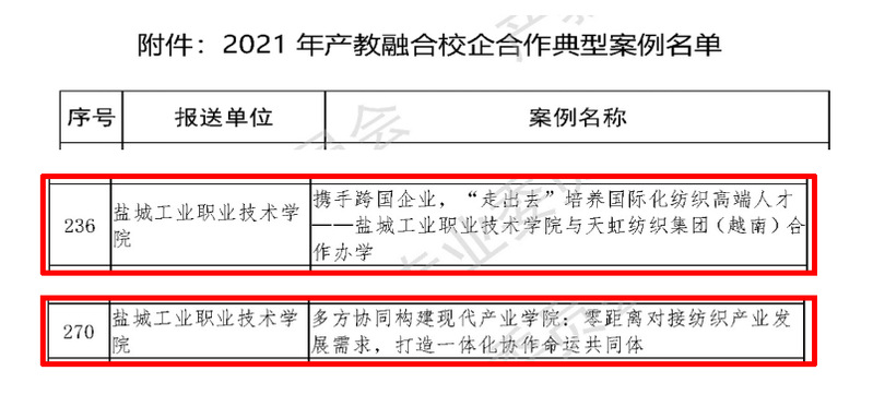 3月24日,中国教育发展战略学会产教融合专业委员会发布了《关于公布2021年产教融合校企合作典型案例名单的公告》,我校推荐的《多方协同构建现代产业学院:零距离对接纺织产业发展需求 打造一体化协作命运共同体》《携手跨国企业 “走出去”培养国际化纺织高端人才——盐城工业职业技术学院与天虹纺织集团(越南)合作办学》两个案例成功入选。