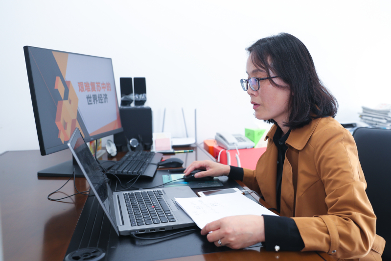 夏燕萍从国际经济的形势、当前疫情的影响等角度出发,围绕“崎岖不平的复苏之路”“影响复苏的多重因素”“促进复苏的中国动力”三个方面开展授课。教学过程中,夏燕萍结合学生实际和时政热点与同学们交谈,有力推动了线上教学活动的开展。