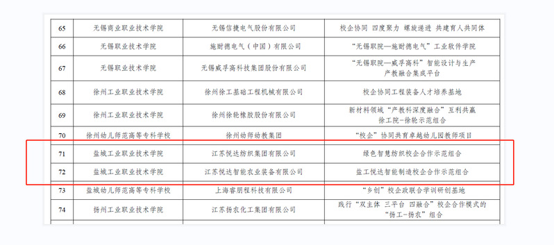 近日,省教育厅公布了2022年江苏省职业教育校企合作示范组合培育项目评审结果,全省高职院校共有80个项目入选,我校申报的两个项目“绿色智慧纺织校企合作示范组合”和“盐工悦达智能制造校企合作示范组合”成功入选。