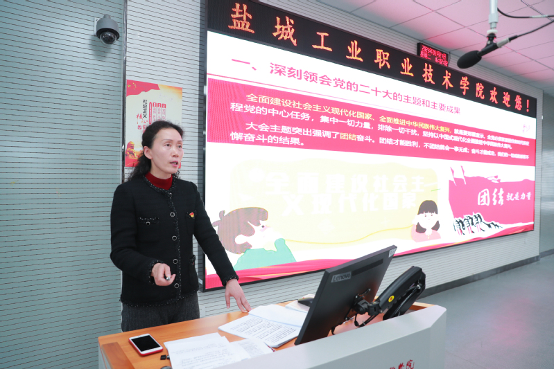 3月21日,副校长孙卫芳在公共教学组团2504智慧教室为联系点师生代表作党的二十大精神专题宣讲。智能制造学院、国际教育学院、体育部、教务处、科技处、高教研究所全体中层干部、师生党员、入党积极分子和联系班级学生参加会议。
