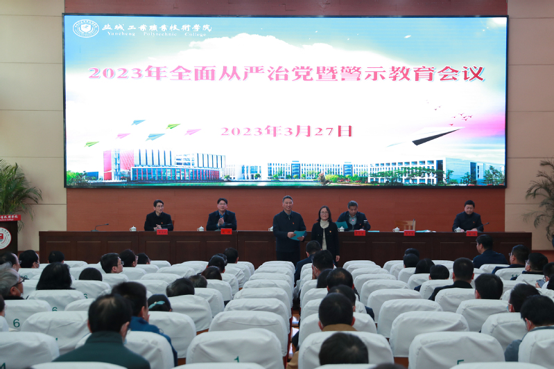 3月27日下午,学校召开2023年全面从严治党暨警示教育会议。会议深入学习贯彻习近平新时代中国特色社会主义思想和党的二十大精神,落实中央纪委二十届二次全会、省纪委十四届三次全会和全省教育系统全面从严治党工作会议部署,总结学校2022年全面从严治党工作,部署安排2023年重点任务。全体在盐校领导、中层干部参加会议。校党委书记邵从清出席会议并讲话,校长瞿才新主持会议。