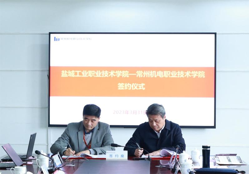 瞿才新和许朝山分别代表两校共同签署了《常州机电职业技术学院与盐城工业职业技术学院结对共建合作协议》。