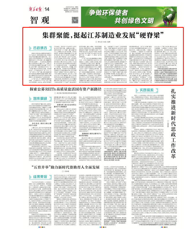 5月19日,《新华日报》“智观”版刊发了由我校党委书记、盐城产教融合发展研究中心智库负责人邵从清教授,经贸管理学院、盐城产教融合发展研究中心智库研究员张漫博士和中韩〈盐城〉产业园创新发展研究院研究员寇铮博士撰写的研究报告《集群聚能,挺起江苏制造业发展“硬脊梁”》。