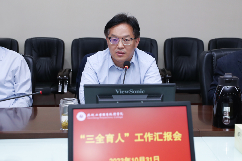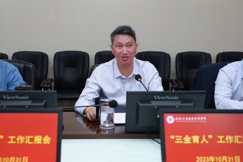 校党委书记邵从清在讲话中强调,推进“三全育人”综合改革,是落实立德树人根本任务、加强和改进思想政治工作、构建更高水平人才培养体系的内在要求,也是建设国内一流高水平高职院校的现实需要。各党总支、直属党支部,各二级学院、部门一定要高度重视,把推进“三全育人”综合改革作为一项战略性任务来抓。一要进一步提高思想认识,增强做好“三全育人”工作的使命感和责任感。二要进一步抓好工作落实,深入推进“三全育人”综合改革出实效。三要进一步强化工作协同,努力构建“大思政”工作格局。四要进一步凝练经验做法,打造具有学校特色的育人工作模式。他号召全校党员干部和教职员工用心投入、用情感染、用爱呵护、用力前行,切实把“三全育人”工作做细做实做优,不断开创新时代学校思想政治工作新局面,为加快建成一流高水平高职院校作出新的更大贡献。