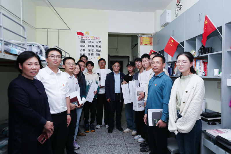交流会后,刘玉申走进了5209宿舍,逐一询问了学生的姓名、籍贯和家庭情况,关心同学们饮食是否习惯、生活设施是否方便等,并为宿舍同学发放了学习用品。他勉励同学们要珍惜校园时光,抓住发展机遇,做好大学生涯规划,学好专业知识,提升职业技能,努力突破自我、超越旧我、培塑新我。他叮嘱同学们在生活和学习上有任何问题,应及时向辅导员和老师们寻求帮助,同时强调要增强安全防范意识,保持积极向上的状态,养成良好的生活习惯,锤炼过硬本领,争做新时代“四有”好青年。