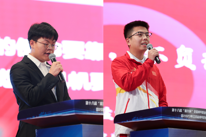 闭幕式上,我校2023年全国职业院校技能大赛工业网络智能控制与维护赛项一等奖获得者曾文凯、世界技能大赛电气装置项目金牌获得者余守安作了青年技能人才主旨分享。现场发布了盐城市首批“碳路先锋 青年出列”青春攻关项目。李晓明为第十八届“振兴杯”全国青年职业技能大赛江苏队授旗。