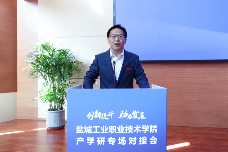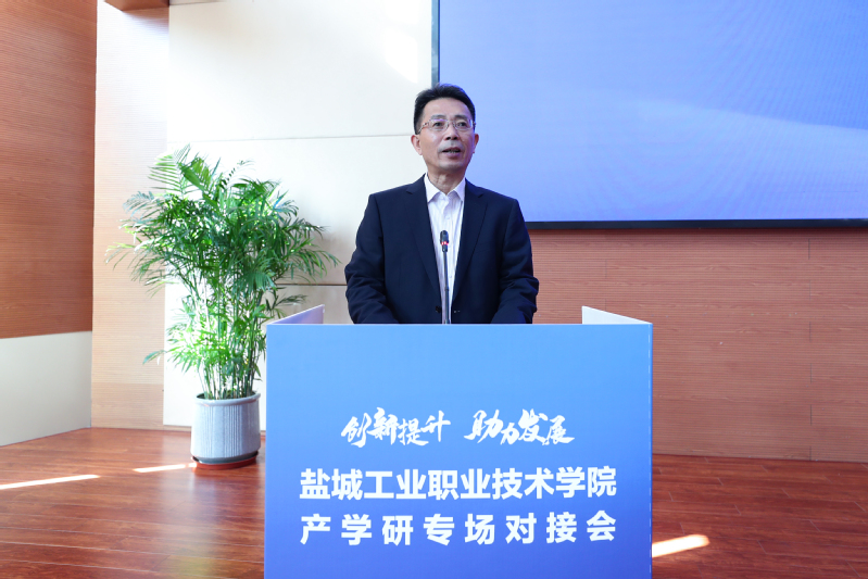 韦向东代表市科技局致辞,对本次对接会的成功召开表示祝贺。他介绍了盐城科技产业发展概况,强调了科技创新的重要性,指出高校院所是提升区域创新力的重要力量。韦向东充分肯定了我校在产学研合作方面取得的成绩,希望学校继续发挥人才、科创等方面优势,促进科技与产业深度融合,增强区域发展核心竞争力,为推动盐城高质量发展贡献力量。