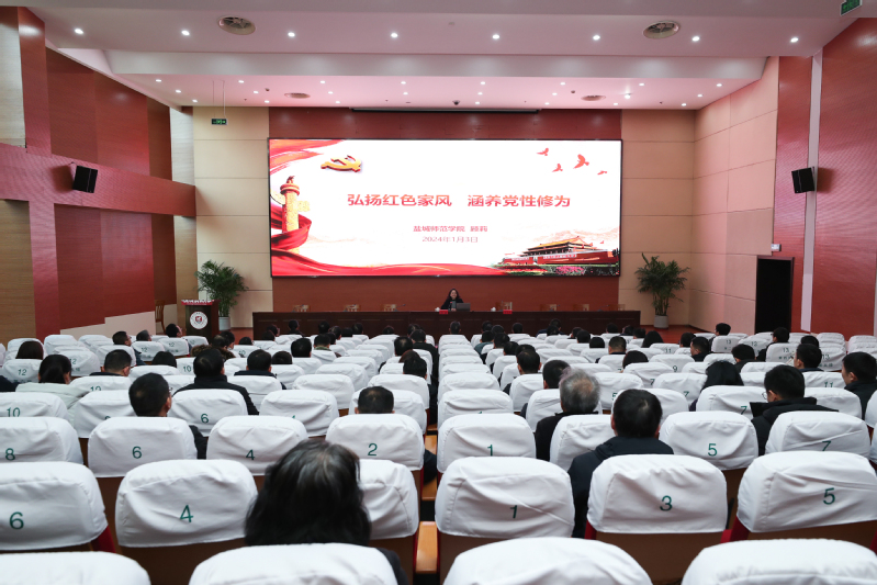 1月3日下午,学校纪委邀请盐城师范学院顾莉教授在学术报告厅作《弘扬红色家风 涵养党性修为》的专题讲座。学校党委领导班子全体成员,全体中层、基层干部和纪委全体工作人员参加讲座。讲座由纪委书记顾玉萍主持。
