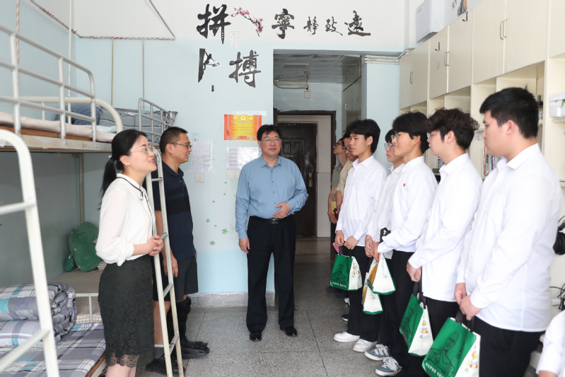 会后,蔺俊走访了学院4417学生宿舍,给同学们送上诚挚的节日问候。他详细了解了同学们的学习和生活情况,并围绕学习环境、宿舍生活、服务保障等问题与同学们进行了亲切交流。