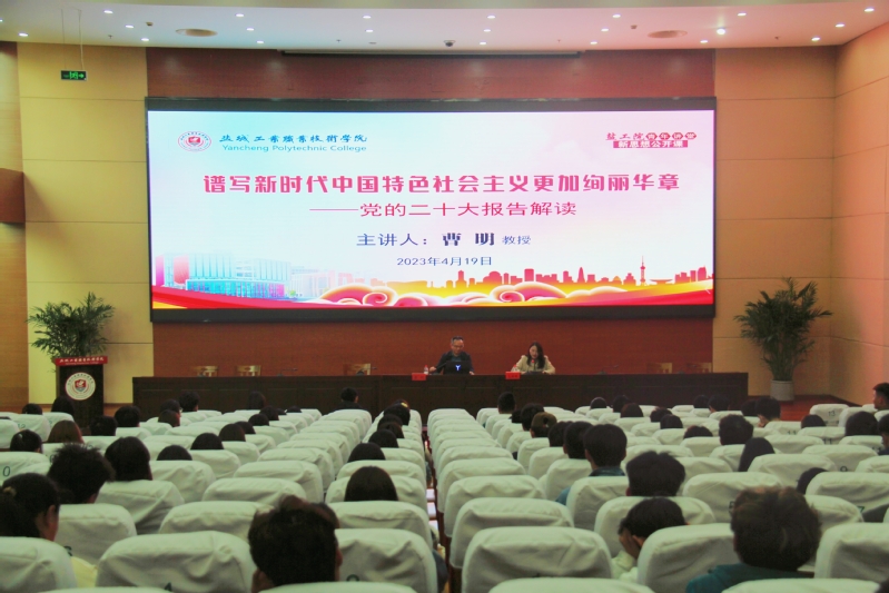 4月19日,盐城师范学院曹明教授应邀来校在学术报告厅作了题为《谱写新时代中国特色社会主义更加绚丽华章——党的二十大报告解读》的专题讲座。校团委全体人员,校院两级学生骨干,各二级学院学生代表共计200余名师生到场聆听。讲座由团委书记包婷婷主持。